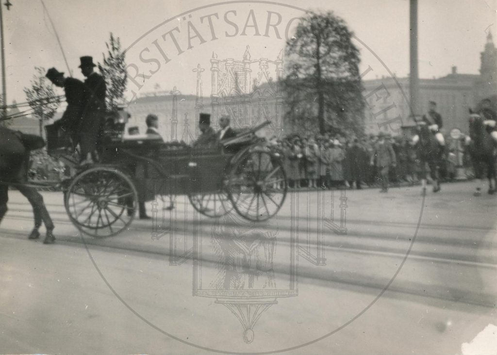 Kutschfahrt des neugewählten Rektors Friedrich Falke über den Augustusplatz, Leipzig 1929.